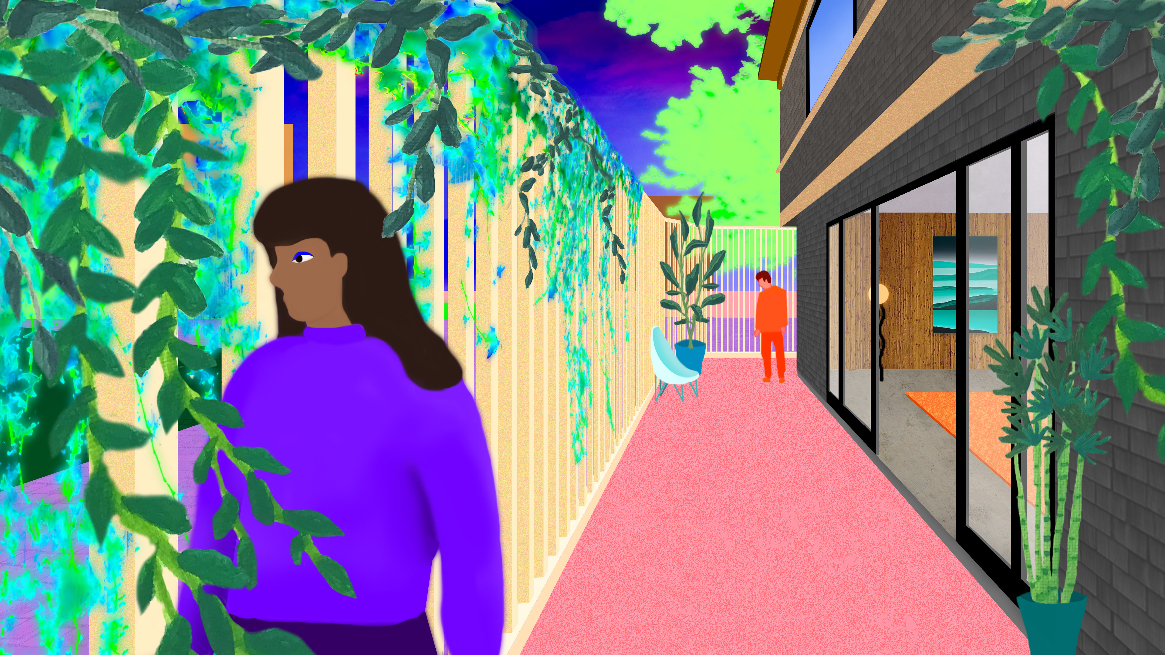 A series of architectural illustrations depicting BLDUS's radically sustainable alley house in Washington, D.C. Thoughtfully designed with regional materials and stylish logic, this design adds a subtle and expertly detailed piece of architecture to the dense residential fabric of Northwest DC. Through the use of colorful illustration, sampled photography, and hand painted elements, I created a visual style which situates the warm interiors within an otherworldly ambience - like that of an evening following a summer rainstorm.