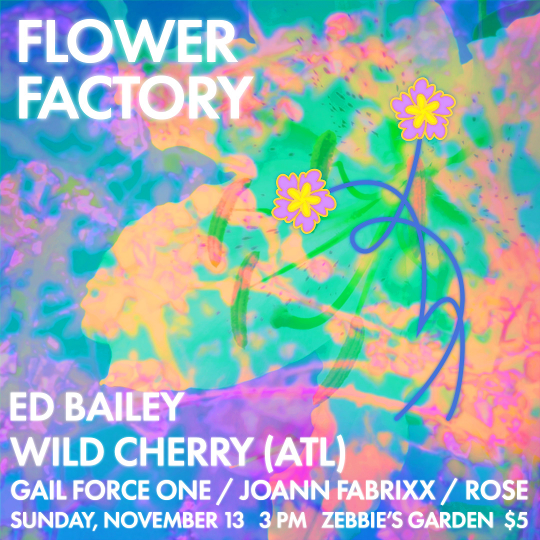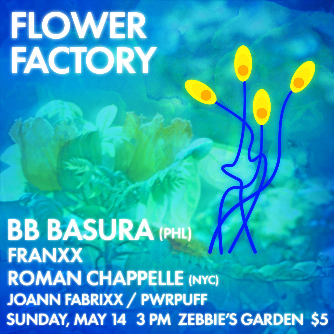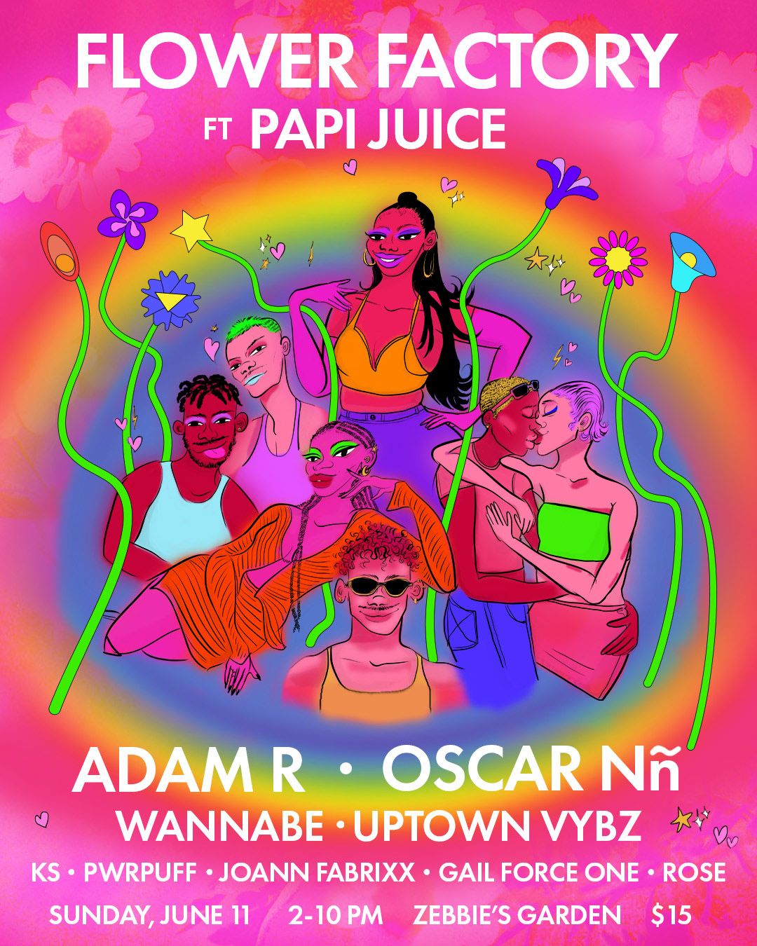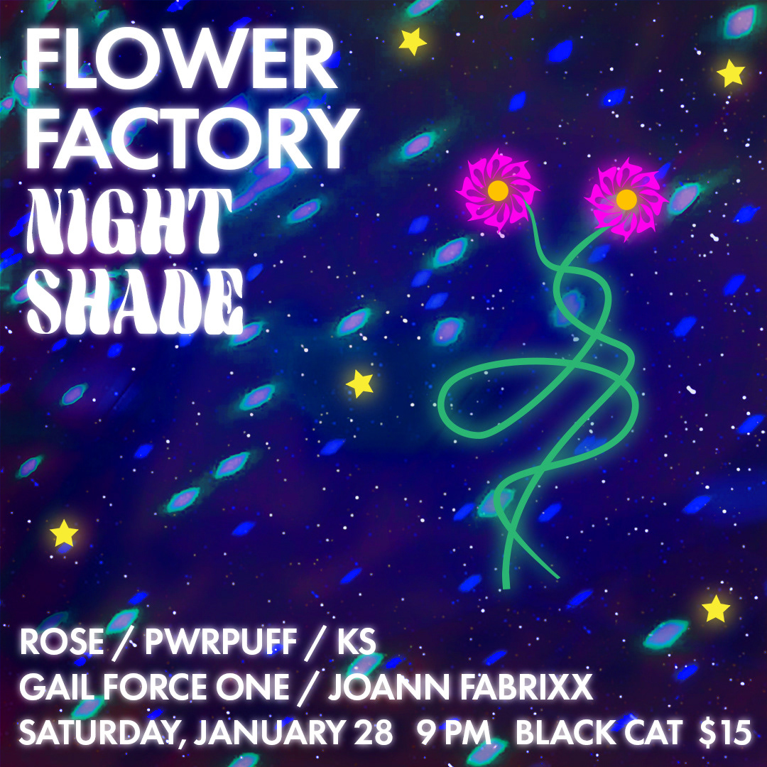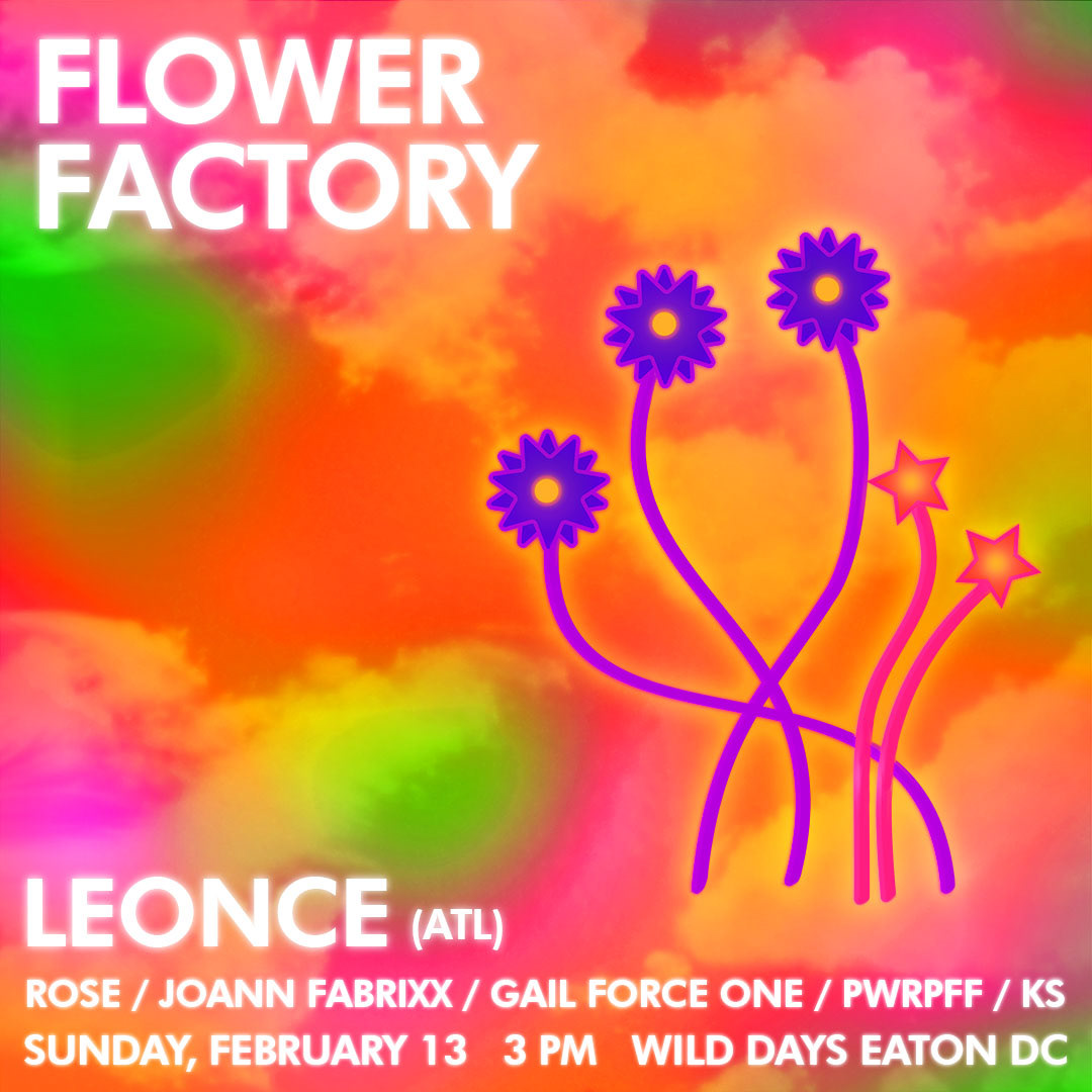 Design and visual branding for DC queer dance party. The Flower Factory logo is at once ordered and playful, combining the factory and gear motif with a large, slightly irregular flower.